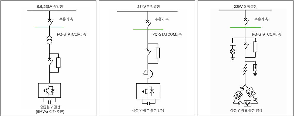 - PQ-STATCOMH 은 IGBT 기반 H-bridge Unit을 직접 연결하는 모듈형 구조(MMC)를 채택했습니다. Y결선 또는 Δ결선 방식을 통해 고압 계통에 직접 연결할 수 있으며, 설치의 단순성과 신뢰성을 동시에 확보합니다.